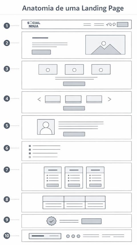 A anatomia de uma landing page é composta por seções estrategicamente organizadas para guiar o visitante desde o primeiro contato até a conversão. Cada bloco tem uma função clara dentro da jornada do usuário, equilibrando clareza, persuasão e foco em uma única ação principal.